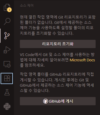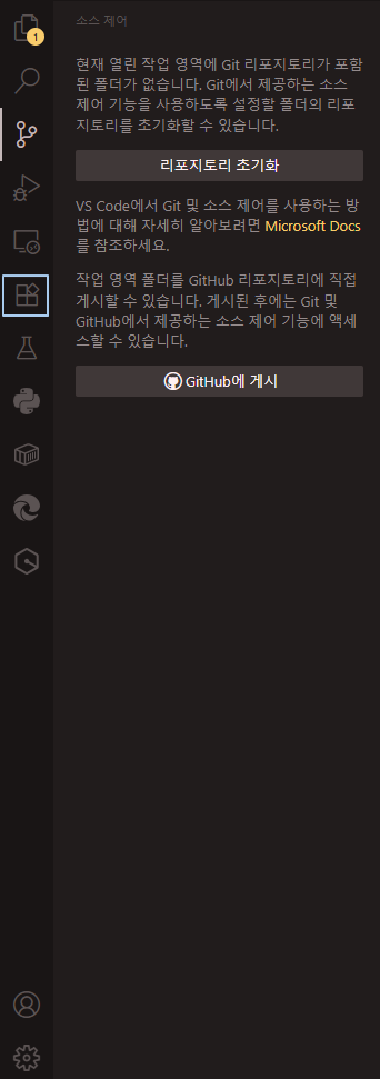 정상적으로 설치가 되셨다면, 확장 탭이 있던 사이드바에 새로운 그림이 생겼을 것 입니다. 만약 없으시다면 설치를 하셨는지 확인해보시고, 설치가 되어있지만 안보인다면 Visual Studio Code를 껏다 켜주세요.